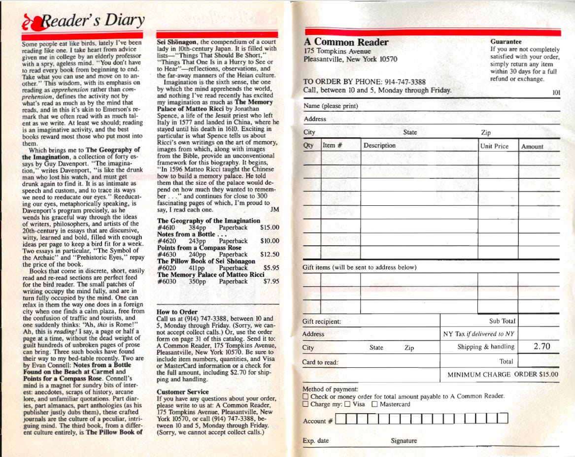 “Some people eat like birds, lately I’ve been reading like one.” That’s the opening line of the “Reader’s Diary” that appears on the last page of A Common Reader No. 1. The diary faced the order form, which we were hoping people would fill with some of the titles on offer in the preceding pages, clip out, and mail in with a check (this was before Al Gore invented the internet: the old-fashioned was still the only fashion in vogue). A week or so after we sent the catalogs out—I can’t recall how many that initial mailing entailed—we got our first envelope back. It had somehow been opened en route to us: the order was there, but the check had disappeared. This may have well been a portent, but if so, it took twenty years to come to fruition, which meant hundreds of thousands of orders were received, and a few million books sold and shipped, before fate finally focused its forces to consign the enterprise to an inelegant end.
